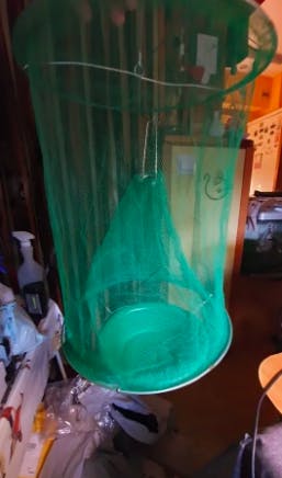 Clipsez le cône intérieur sur la partie supérieure du filet. Glissez le bol vert dans le cercle de fer qui se trouve au fond du filet. Mettre l’appât dans le bol. Accrochez le piège dans une zone de mouche dense.
